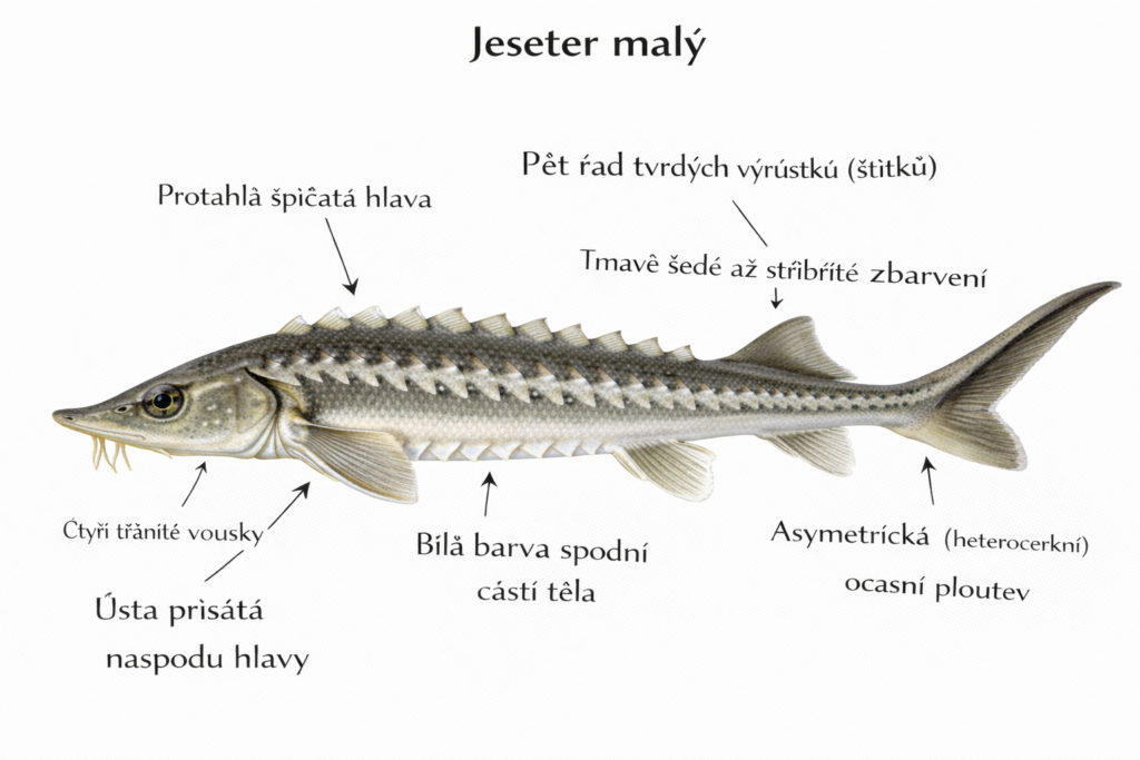 Jeseter malý je díky svým kostěným štítkům, dlouhému rypci a vouskům na spodní straně hlavy snadno rozpoznatelný a mezi našimi rybami zcela jedinečný.