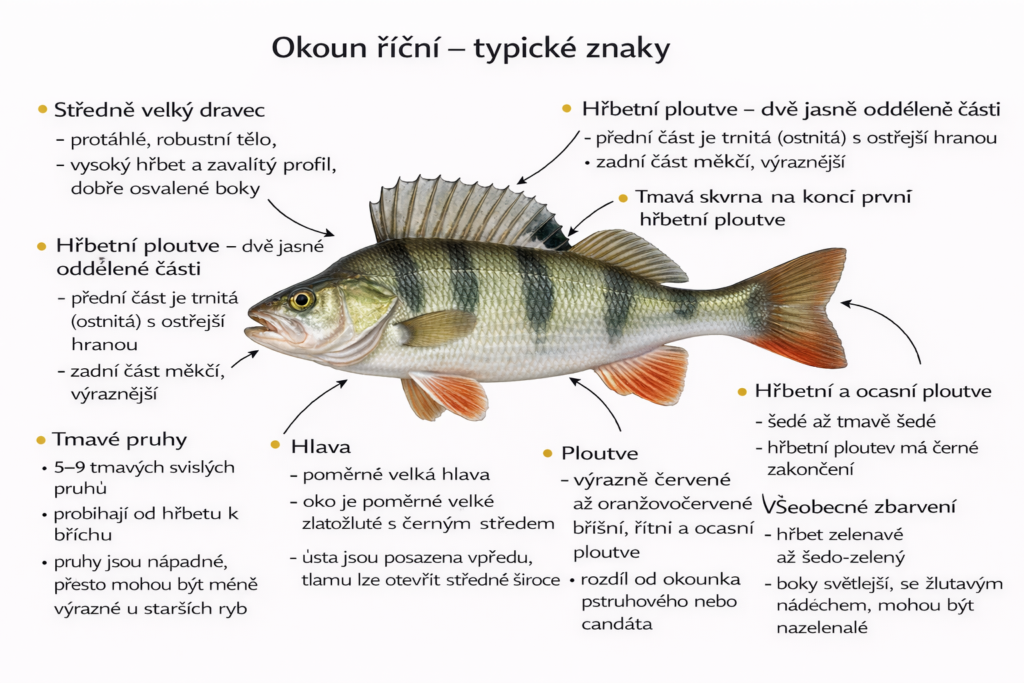 Okoun říční je díky tmavým příčným pruhům a červeným ploutvím prakticky nezaměnitelný. Tyto znaky zároveň odrážejí jeho dravý způsob života a schopnost efektivního lovu v různých typech vod.